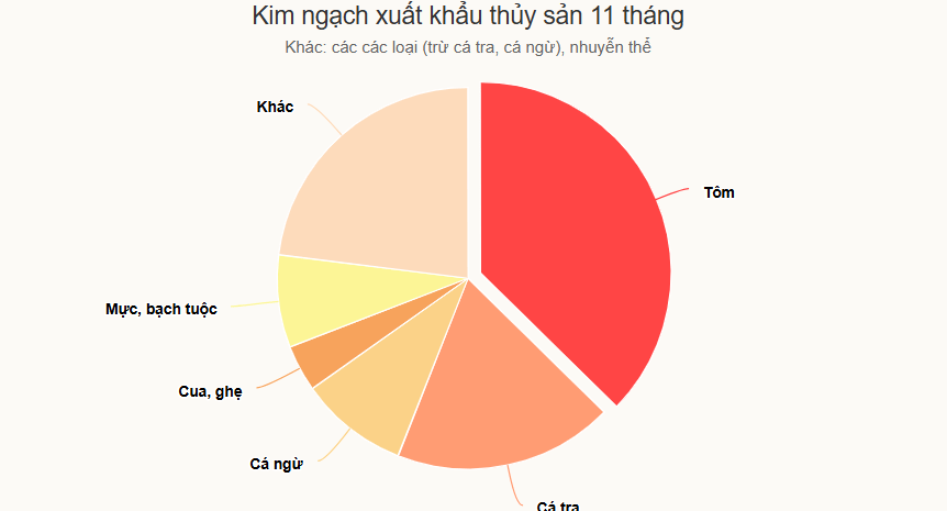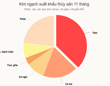 Trong 11 tháng qua, tôm, cá tra và cá ngừ là top 3 sản phẩm mang lại kim ngạch cao nhất. Ngoài ra, một số sản phẩm như cua ghẹ, nhuyễn thể có vỏ và mực bạch tuộc cũng ghi nhận mức tăng trưởng cao. Trong đó, cua ghẹ và nhuyễn thể có vỏ tăng trưởng lần lượt 60% và 66%.